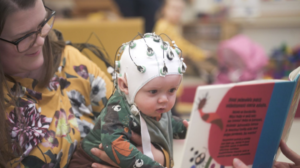 Foto: A imagem mostra um bebê usando um capuz com sensores enquanto observa um livro conduzido por um adulto. A cena ilustra um ambiente de pesquisa sobre desenvolvimento infantil, alinhado às investigações do projeto EarlyMath, que estuda como crianças pequenas aprendem e interagem com diferentes estímulos educacionais.